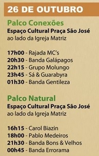 Entre as atraçõ estão a banda Gentileza, o grupo Molungo e a dupla Sá e Guarabyra.