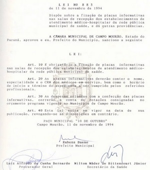 Desde 1994 existe uma lei em Campo Mourão que obriga a fixação de placas nos postos de saúde informando o nome do médico em serviço.
