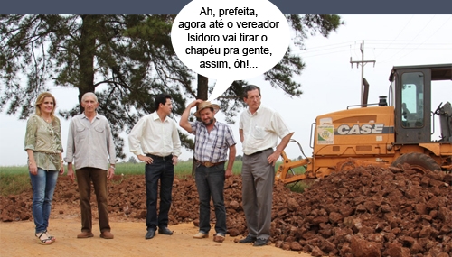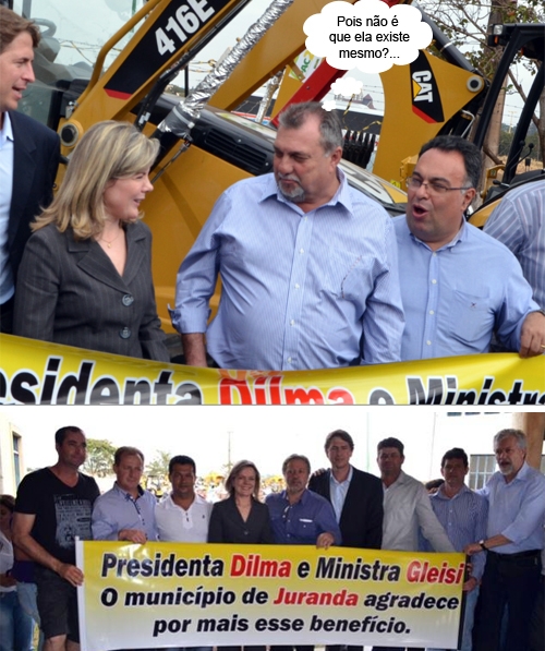 A série "Olha "nóis" com a retroescavadeira da Dilma" tem mais duas figurinhas no álbum. Agora quem aparece fazendo pose são os prefeitos Baco Duarte (Ubiratã) e Bento Batista (Juranda). A entrega das máquinas aconteceu em Toledo, com a presença da ministra Gleisi Hoffmann. E já tinha faixa por lá com agradecimentos em nome de cada município à ministra e à presidenta Dilma. Hummmmmmm...