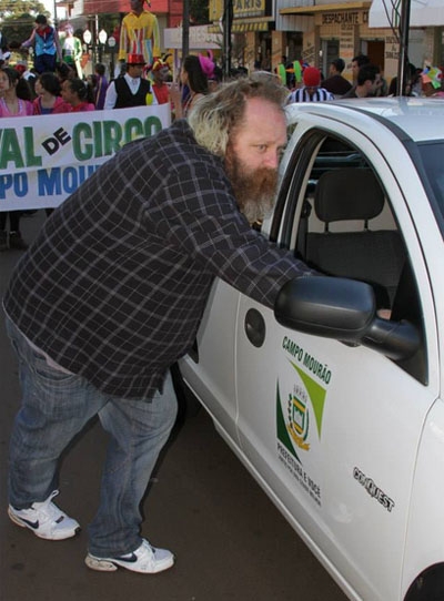 O clic foi feito durante a passeata do 6º Festival do Circo, encerrado no fim de semana, em Campo Mourão. O diretor do Teatro Municipal, Silvio Vikczak, teve que dar uma empurradinha no carro da Fundação Cultural que ia à frente do movimento. Vilczak foi o Papai Noel do ano passado e, pelo xodó com a barba, será novamente este ano. E cá pra nós: que falta faz o trenó numa hora dessas...