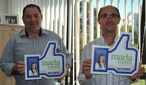 No gabinete da deputada Marla Tureck agora é assim. Quem visita é convidado a fazer uma fotinho segurando a “mãozinha” de curtir do Facebook. As últimas “vítimas” foram o prefeito de Araruna, Fabiano Antoniassi, e se vice, Claudemir Brambilla. Na semana passada isso já tinha acontecido com os vereadores de Campo Mourão Edílson Martins, Olivino Custódio e Toninho Machado.