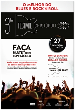 Gosta de rock? E de blues? Então anote aí na agenda. Será dia 27 de setembro (22h), no Espaço Unique, o 3º Festival Cristófoli. O repertório vai incluir Black Sabbath, Cream, Elvis Presley, Eric Clapton, Jerry Lee Lewis, Led Zeppelin, Ramones, Raul Seixas e The Doors, entre outros. O ingresso custa R$ 20 e já está à venda na Cristófli e na Fundação Educere. A renda será para o Lar Dona Jacira. E som na caixa!...