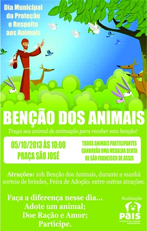 Que tal levar seu bicho de estimação para receber uma bênção, com direito a medalhinha benta de São Francisco de Assis e tudo? Pois saiba que isso vai acontecer neste sábado, num promoção da Pais – Protetores dos Animais Independentes. Será na praça São José, a partir das 10h. O evento terá sorteio de brindes e feira de adoção. Quem quiser aproveitar para doação ração será bem-vindo.