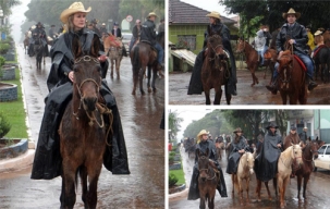 Choveu um monte, mas mesmo assim aconteceu neste domingo a cavalgada em comemoração aos 20 anos de Farol. A prefeita Angela Kraus botou uma capa, um chapéu e encarou o aguaceiro em cima do alasão. O deputado Wilson Quinteiro esteve por lá e acompanhou a prefeita. Ah, São Pedro!...