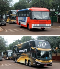 O Expresso Nordeste está completando 50 anos de fundação. As comemorações começaram neste fim de semana com um desfile pela cidade de 11 novos ônibus. À frente da “onibusseata” veio um dos modelos mais antigos da empresa, ainda do tempo das cores vermelha, azul e branca. Entre os novos busões, dois têm quatro eixos e dois andares. Hummmmm..