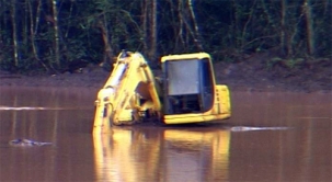 Com chuva, não teve jeito: o lago do Parque do Lago voltou a encher e a máquina que trabalhava no desassoreamento ficou assim: embaixo da água. O clic é de Fábio Nogarolli. Digamos que a versão mourãoense do “Yellow Submarine” dos Beatles. Só que o nosso “submarino amarelo” não viaja, atola. Agora é só cantar: “Atolando no submarino amarelo! No submarino amarelo!...”