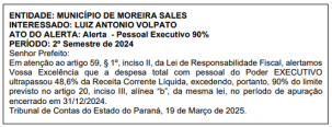 O Tribunal de Contas do Estado publicou nesta terça-feira alertas para mais de 40 municípios. Um deles foi para Moreira Sales. Motivo? Encerrou o período, de 2024, ultrapassando 48,6% da Receita Corrente Líquida com a folha de pagamento. Não atingiu o limite da Lei de Responsabilidade Fiscal, mas já requer atenção do administrador público.