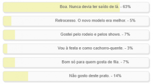 “O que você acha da volta da Festa do Carneiro no Buraco do Parque de Exposições”. Enquete encerrada neste domingo deu vitória, com folga, à alternativa “Boa. Nunca devia ter saído de lá”. Teve 63% dos votos. “Não gosto deste prato” ficou em segundo, com 14%. “Gostei pelo rodeio e pelos shows” e “Bom só para quem gosta de fila” empataram em terceiro, com 7%. O resultado completo está no quadro acima.
