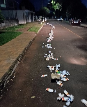 Rastro de embalagens de medicamentos no meio da via pública – travessa Aracaju, no jardim Constantino.
