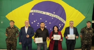 Teve solenidade nesta sexta-feira para comemorar os 30 anos do Tiro de Guerra em Campo Mourão. Durante o evento quatro vereadores foram homenageados – Edilson Martins, Eliane do Café, Professor Geraldo e Subtenente Macedo. O prefeito Douglas Fabrício participou, assim como o ex-vereador Joani Teixeira, que na época fez o pedido para instalação do TG na cidade.