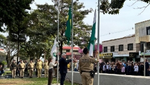 Uma solenidade em frente à prefeitura, na manhã desta segunda-feira, abriu as comemorações da Semana da Pátria em Campo Mourão. O prefeito Douglas Fabrício, a vice-prefeita Fátima Nunes e o comandante do 11º BPM, tenente-coronel Aguinaldo Alencar, hastearam as bandeiras. Três vereadores estavam presentes – Márcio Berbet, Eliane do Café e Hélio HG.