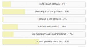 “Como vai ser o presente de Natal que você dará este ano?” Enquete encerrada neste domingo não foi muito otimista, não. Venceu a alternativa “Ah, sem presente desta vez”, com 37% dos votos. “Melhor que o do ano passado” ficou em segundo, com 23%. Em seguido veio “Só uma lembrancinha”, com 16%. O resultado completo está no quadro acima.