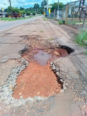 “Agora já tem novo lugar pra fazer carneiro no buraco. Tem várias dessas panelas no acostamento da av. Miguel Luiz Pereira nas imediações da Noma Motors e New Holland. Em dia de fortes chuvas, elas se enchem e não aparecem, sendo um imenso risco de acidentes”.