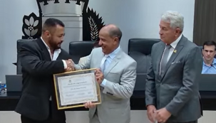 A Câmara de Campo Mourão encerrou nesta quarta-feira a “maratona” de entregas de homenagens em abril. A sessão solene foi para entregar moção ao advogado Elso de Souza Novais, pelo trabalho como presidente do Conselho Comunitário de Segurança. Ele recebeu a homenagem das mãos do vereador-autor, Subtenente Macedo, e do diretor de Trânsito Nelson João Casaroli. Sete vereadores prestigiaram a sessão.