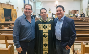 Oclecio Meneses, prefeito de Farol, durante a posse o padre Wesley na paróquia Santo Antônio, depois do bispo d. Evandro Luís Braun, entregar a chave da igreja ao pároco; nesta quarta-feira, em evento que também teve a presença do prefeito de Boa Esperança, Joel Buscariol.