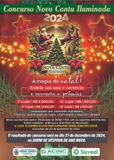Nova Cantu – A prefeitura vai premiar as casas e os comércios com os melhores enfeites de Natal. O primeiro lugar ganha R$ 3 mil; o segundo R$ 1,5 mil e o terceiro e quarto R$ 1 mil cada.