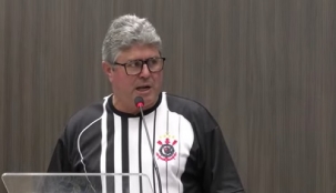 Paulo Pilatte (PL), vereador em Campo Mourão, ao discursar na sessão desta segunda-feira, usando a camisa do Corinthians. Na véspera, o Timão venceu o Palmeiras por 2 a 0, vitória no clássico que não acontecia havia três anos.