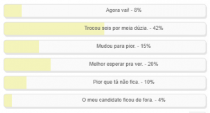 “O que você achou da composição da nova Câmara?” Enquete encerrada neste domingo deu vitória à alternativa “Trocou seis por meia dúzia”, com 42% dos votos. Para 20%, “Melhor esperar pra ver” e, para 15%, “Mudou pra pior”. O resultado completo está no quadro acima.