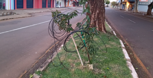 Na "capital do fio solto" vale tudo. Até usar árvore ainda pequena como suporte de fio caído. O flagra é da av. Manoel Mendes de Camargo.