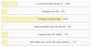 "O que mais te preocupa no momento?" Enquete com esta pergunta foi encerrada neste domingo. A alternativa "A covid que ainda está por aí" ficou em segundo lugar, com 16% dos votos. Em primeiro, disparado, ficou "A inflação subindo tudo". Teve 61% da votação total. O resultado completo está no quadro acima.