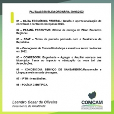 Os prefeitos da região se reúnem nesta sexta-feira em assembleia geral da Comcam. Será a partir das 8h30, na sede da entidade, em Campo Mourão. Na pauta, oficina do Paraná Produtivo, termo de parceria pactuado entre a entidade e Presidência da República; ampliação de serviços de engenharia aos municípios da região; entre outros.