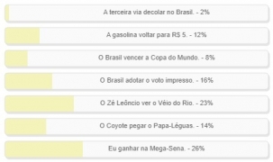 Enquete com esta pergunta foi encerrada neste domingo teve vitória da alternativa "Eu ganhar na Mega-Sena", com 26% dos votos. "Zé Leôncio ver o Véio do Rio" ficou em segundo, com 23%. Já "O Brasil adotar o voto impresso" teve 16%. O resultado completo está no quadro acima.