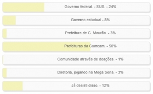 "Quem deve ajudar mais para resolver o problema financeiro da Santa Casa de Campo Mourão?" Enquete encerrada neste domingo deu vitória à alternativa "Prefeituras da região", com 50% dos votos. "Governo federal - SUS" ficou em segundo, com 24%. "Já desisti disso" teve 12%. O resultado completo está no quadro acima.