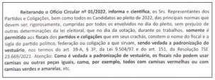 O eleitor, sozinho, pode usar a cor que quiser, mas não pode haver aglomeração de pessoas portando vestuário padronizado.
