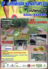 Acontece no próximo domingo (8h) a 6.a Caminhada Internanacional na Natureza de Luiziana. O circuito Cachoeira Rio Sem Passo tem 11 km entre trilhas e estradas rurais. A promoção é do IDR e da prefeitura. A caminhada é de graça, mas existem as opções de café da manhã (R$ 15) e almoço (R$ 30). Ainda este ano acontecem os circuitos de Goioerê (4 de dezembro) e de Altamira do Paraná (11).