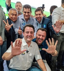 O governador Ratinho Jr participou de evento de campanha, na terça-feira, em Maringá. Vários prefeitos da região estiveram por lá. O presidente da Comcam, Leandro de Oliveira (Araruna), até discursou. Na foto, além dele, estão Akio Abe (Quarto Centenário), Vivaldo Lessa (Roncador) e Edmilson Moura (Terra Boa).