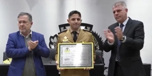A Câmara de Campo Mourão realizou sessão solene nesta terça-feira. Motivo? Entrega o título de Mérito Militar Mourãoense ao comandante do subgrupamento do Corpo de Bombeiros, capitão Anderson Luiz Feijó. A entrega foi feita pelo prefeito Tauillo Tezelli e pelo vereador autor, Edilson Martins.