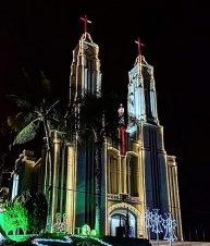 O que é isso? A Catedral São José, de Campo Mourão, decorada para o Natal? Na-nani-nanã! Essa aí e a paróquia Sagrado Coração de Jesus, da cidade de Antônio Carlos/SC. Trata-se de uma das "irmãs gêmeas" da paróquia de Campo Mourão. O projeto arquitetônico é mesmo, assim como ocorre em São Bento do Sul/SC. São trigêmeas idênticas.
