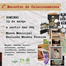 Acontece neste domingo, partir das 8h, em Campo Mourão, o 2º Encontro de Colecionadores. O evento faz parte das comemorações pelos 45 anos de fundação do Museu Municipal Deolindo Mendes Pereira. Podem participar colecionadores de moedas, cédulas, discos, miniaturas, cartões telefônicos, cartões postais, chaveiros, medalhas e chaveiros, entre outros.