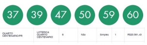 Dois sortudos - um de Betim/MG e outro do Recife/PE- acertaram as seis dezenas da Mega Sena sorteada nesta quarta-feira. Cada um ganhou R$ 37,4milhões. A quina teve 296 apostas ganhadoras e cada uma levou prêmio de R$ 20,5 mil. Uma delas foi feita na lotérica Quarto Centenário, na cidade da região com o mesmo nome.