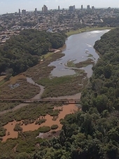 Foto feita com drone dá uma ideia do tamanho do assoreamento no Parque do Lago, em Campo Mourão.