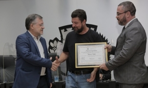 O jornalista Dilmércio Daleffe recebeu nesta terça-feira moção da Câmara de Campo Mourão. A entrega aconteceu em sessão solene. O vereador autor, Marcio Berbet, entregou a homenagem ao lado do prefeito Tauillo Tezelli. A sessão teve a presença de sete vereadores.