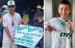 Apelo nas redes - Aí entrou em cena um primo dele, que usou as redes sociais para fazer um apelo ao Palmeiras. Pegou a foto de João Vitor com o cartaz vetado e mandou ver. E não é que deu certo? O menino recebeu uma camisa autografada pelo elenco do Verdão. Detalhe: o primo que fez o apelo é o corintiano Diego Reis.