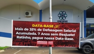 Faixa colocada em frente ao câmpus da Unespar de Campo Mourão. Os servidores acusam defasagem salarial de 35% e cobram o cumprimento da data-base. Frisam que não há reposição há sete anos. Para esta sexta-feira foi marcada paralisação em todo o Estado. Além da cobrança do reajuste salarial, o protesto vai lembrar os sete anos do 29 de abril, que os professores estaduais chamam de "massacre do Centro Cívico".