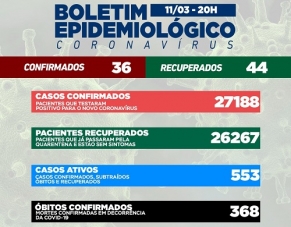 Trinta e seis casos de covid-19 foram confirmados nesta sexta-feira em Campo Mourão. Os recuperados foram 44. Isto quer dizer que o número de casos ativos caiu mais um pouquinho e fechou o dia em 553. Na ala covid seguem três as internações, todas na UTI. Estão internados moradores de Iretama, Nova Cantu e Terra Boa.