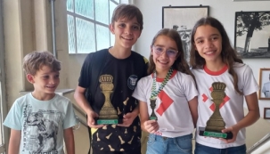 Cinco enxadristas de Campo Mourão participaram no fim de semana, em Belo Horizonte/MG, do Campeonato Brasileiro de Xadrez Escolar. O evento reuniu mais de 450 participantes de todo o País. Os mourãoenses voltaram para casa com dois títulos no sub-12. Rafael Tuma Soares foi campeão masculino e Natália de Oliveira Biazon no feminino. Já Heloise de Oliveira Biazon ficou em terceiro lugar na mesma categoria. Também competiram Lucas José de Oliveira Biazon e Vinicius Tuma Soares