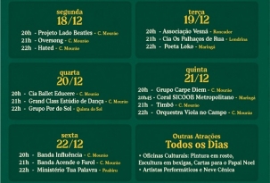O projeto Atividades Culturais Campo Mourão Cidade Natal 2023 inicia nesta segunda-feira sus última etapa de atrações. Agora é a Mostra Cultural, que acontecerá até sexta-feira na praça São José. Serão pelo menos três apresentações por noite. No primeiro dia, por exemplo, tem Projeto Lado Beatles e as bandas Oversong e Hated. A programação completa está na ilustração acima.