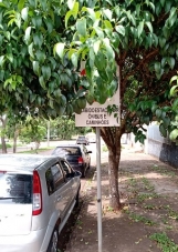 Placa de sinalização de trânsito encoberta pela árvore no final da av. Manoel Mendes de Camargo perto da av. Miguel Luiz Pereira.