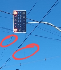 “Semáforo da av. Pedro Viriato com a rua Sanhaço. Cabos de internet se enroscaram no semáforo. Se mais algum caminhão passar e enroscar pode até danificar o semáforo ou causar acidentes”.