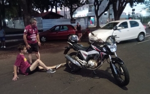 Motociclista sofre acidente após a moto se enroscar em fios soltos. Foi neste domingo no início da noite, perto da Catedral.