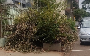 Calçada bloqueada há vários dias na rua Laurindo Borges, centro de Campo Mourão.