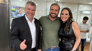 O pré-candidato a prefeito de Campo Mourão Rodrigo Salvadori (PP) esteve em Maringá nesta sexta-feira. No estande da Assembleia Legislativa Itinerante, na Expoingá, se encontrou com os deputados Maria Victoria (PP) e Delegado Jacovós (PL). Entre os assuntos em pauta, o apoio do PL à pré-candidatura dele e a possível indicação do partido para o candidato a vice-prefeito.
