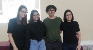 Na foto, as alunas que apresentaram o trabalho, Aline Ambrosio, Francieli Bengozi e Karine Lopes, com o professor Fabio Alexandre da Silva