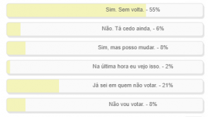 “A campanha começou. Você já definiu o seu candidato?” Enquete encerrada neste domingo deu vitória à alternativa “Sim, sem volta” com 55% dos votos. Em segundo ficou “Já sei em quem não votar”, co0m 21%. “Sim, mas posso mudar” e “Não vou votar” empataram com 8%. O resultado completo está no quadro acima.