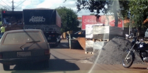 “Dois em um! Cruzamento da av. Goioerê com rua Roberto Brzezinski. A carretona ignora a lei municipal 2882/2012 e os materiais de construção dispostos na pista de rolamento fere o art. 54 do Código de Posturas do Município”.