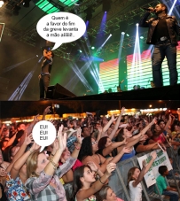 Os cliques são deste domingo, quando o Parque de Exposições de Campo Mourão ficou lotado para o show com a dupla Zezé di Camargo & Luciano. Pudera. Entrada franca bancada pela Lei de Incentivo à Cultura do governo federal. A prefeita Regina Dubay assistiu tudo na primeira fila. Ah, em tempos de greve de servidores, nada com um showzinho pra descontrair...
